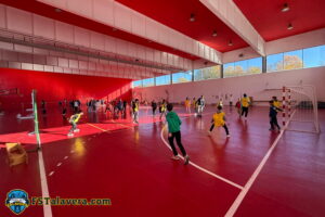 Tras este primer bloque, la actividad se trasladó al polideportivo cubierto del centro, escenario de la parte práctica, siempre la más esperada por los chicos y chicas. Allí pudieron trasladar a la pista lo aprendido, compartiendo ejercicios, desafíos y momentos de interacción directa con los propios jugadores. El ambiente, marcado por el entusiasmo juvenil, convirtió el pabellón en un pequeño laboratorio deportivo donde la teoría cobró vida. La visita concluyó con la tradicional foto de familia, un gesto que resume el proyecto: deporte, comunidad y futuro. Como broche final, el club obsequió a los estudiantes con un detalle especial que les permitirá disfrutar del fútbol sala en directo en el Pabellón ‘Sandra Sánchez – Primero de Mayo’, un guiño más para seguir estrechando lazos entre el FS Talavera y los aficionados más jóvenes. Aula Futsal, una vez más, dejó huella. Y en el IES Padre Juan de Mariana, la semilla ya está sembrada.